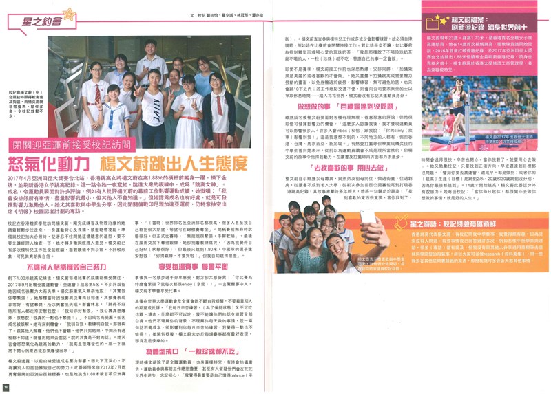 Congratulations to Poon Yik Pui of 5A! Her news article has been selected and published on the event brochure of the 21st Mingpao Student Reporter Scheme. Yik Pui has gained a lot of valuable knowledge and experience by participating. For example, she has the opportunity to interview Cecilia Yeung Man Wai, a high jumper who broke the Hong Kong record in 2016 and won a silver medal at the 2017 Asian Athletics Championships.