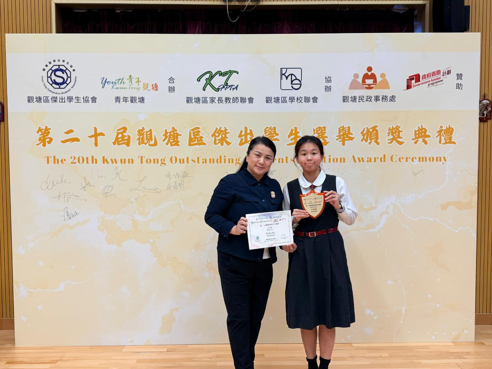 We are delighted to announce that two of our nominees received high honours in the Senior Secondary category. Lam Hei Tung was awarded the Distinguished Students Award (優秀學生獎), while Chu Ka Ying earned the Outstanding Students Award (傑出學生獎), receiving both a certificate and a trophy.