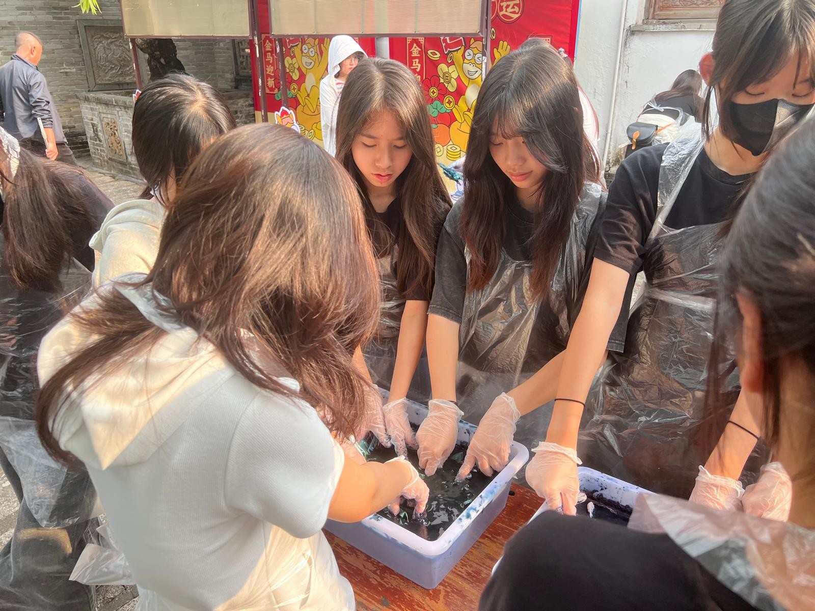 我們去體驗傳統手工紮染工藝,透過不同手法捆紮橡皮筋,再染色,最終呈現出兩種不同圖案的藍白紋樣。這次紮染採用的是天然板藍根萃取的植物染液,屬環保的天然染料,是傳承千年的傳統染色技藝。整個製作過程充滿趣味與創造性,每一件成品都因手工操作的獨特性而獨一無二。